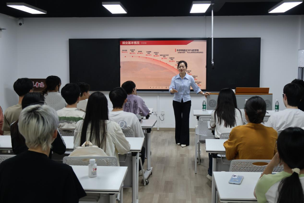 刘白从当前书院升学与就业的形势出发,结合详实数据提出几点建议。她提到,升学契合书院培养理念,建议学生采取“就业与考研两手抓”策略,合理分配时间,制定好人生长期职业规划。
