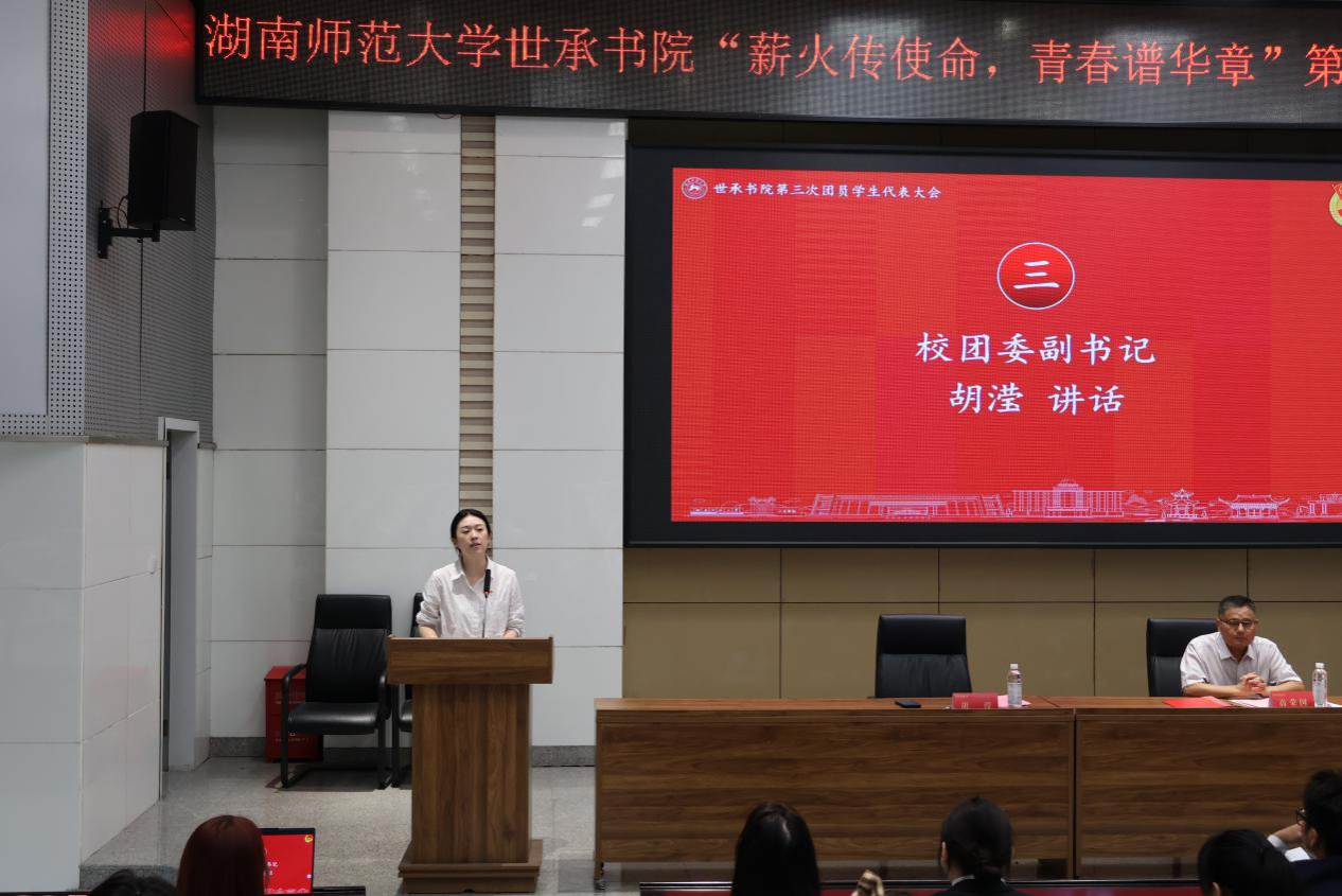 胡滢发表讲话。她代表共青团湖南师范大学委员会对世承书院第三次团员学生代表大会顺利召开表示热烈祝贺,并充分肯定了世承书院成立至今在团学工作,特别是创新创业领域取得的突出成绩。她引用毛泽东同志话语,对新一届团员学生干部提出要将“事上练”作为自身成长成才的必经之路,在具体事务中锤炼能力、积累经验;在重活累活上敢于担当、修炼心态。最后她鼓励世承青年要聚焦拔尖创新,提升核心竞争力,弘扬科学家精神,努力成为听党话、跟党走,堪当民族复兴重任的社会主义建设者和接班人。