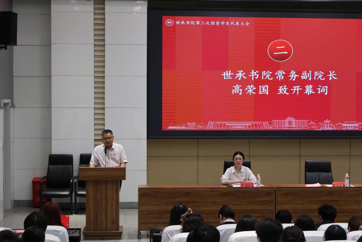 大会在庄严的国歌声中拉开序幕。高荣国致开幕词,他向一直关心支持书院团学工作发展的领导老师和辛勤付出的团学干部表示衷心的感谢,同时回顾了书院团学工作过去一年取得的骄人成绩。最后他对书院团学干部和团员学生提出三点期望:一是要成为世承青年的优秀代表。要重视创新、科研和深造,笃定“吾辈当以学识报国,不负时代,不负家国厚望”的目标;二是要真心实意为同学服务。甘于奉献,勇于担当,以迎难而上的勇气对待挑战,以任劳任怨的态度投入工作,真正成为同学们成长路上的贴心人、带头人;三是要注意工作方法。工作要“接地气”,了解同学们的真实想法和迫切需求;要“讲协同”,学会任务分解、责任到人、协同推进;要“有回音”,对于老师交代的工作,同学们反馈的问题,做到“事事有交代,件件有着落”。