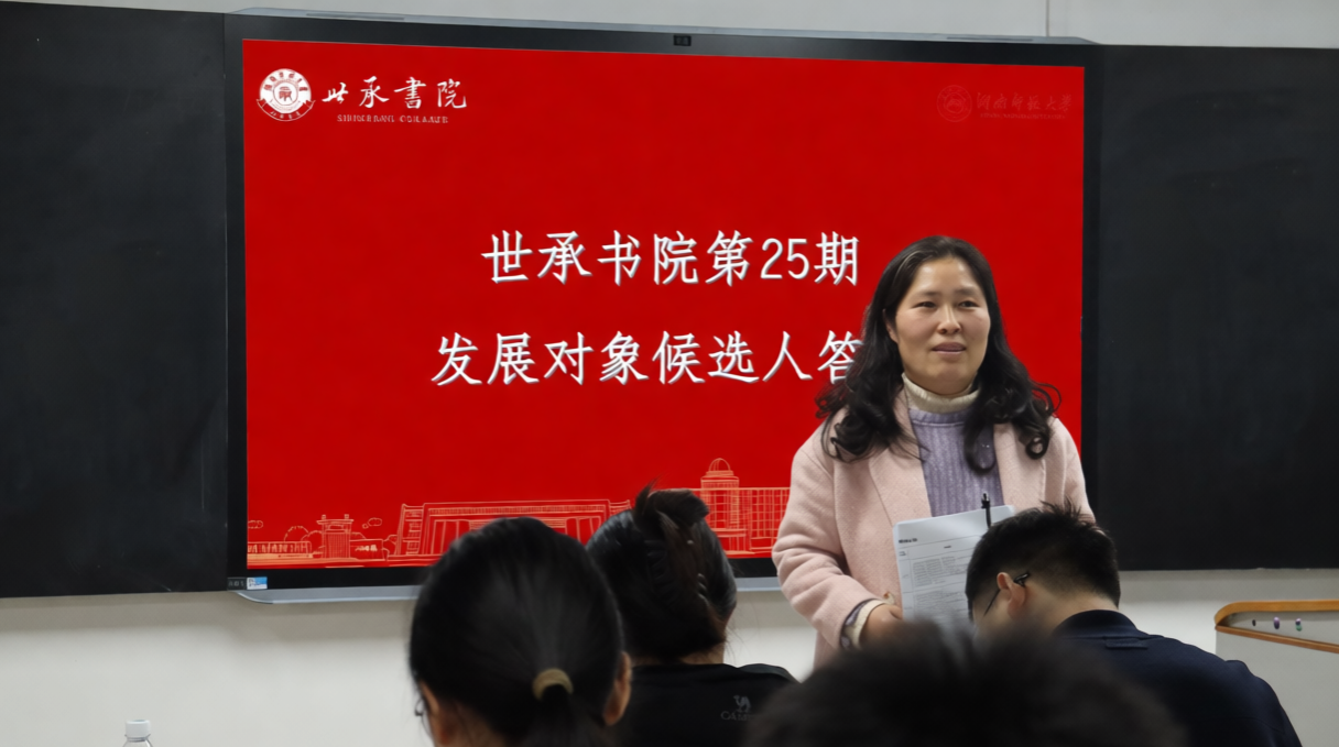 (通讯员 杨倩)3月19日,世承书院第25期党员发展对象候选人答辩会在书院128研讨室顺利举行。世承书院副院长兼直属党支部副书记罗艳,学生事务管理办公室主任杜涛、团委书记刘铮,辅导员彭诚意、唐晓曼、洪锐出席本次答辩会。