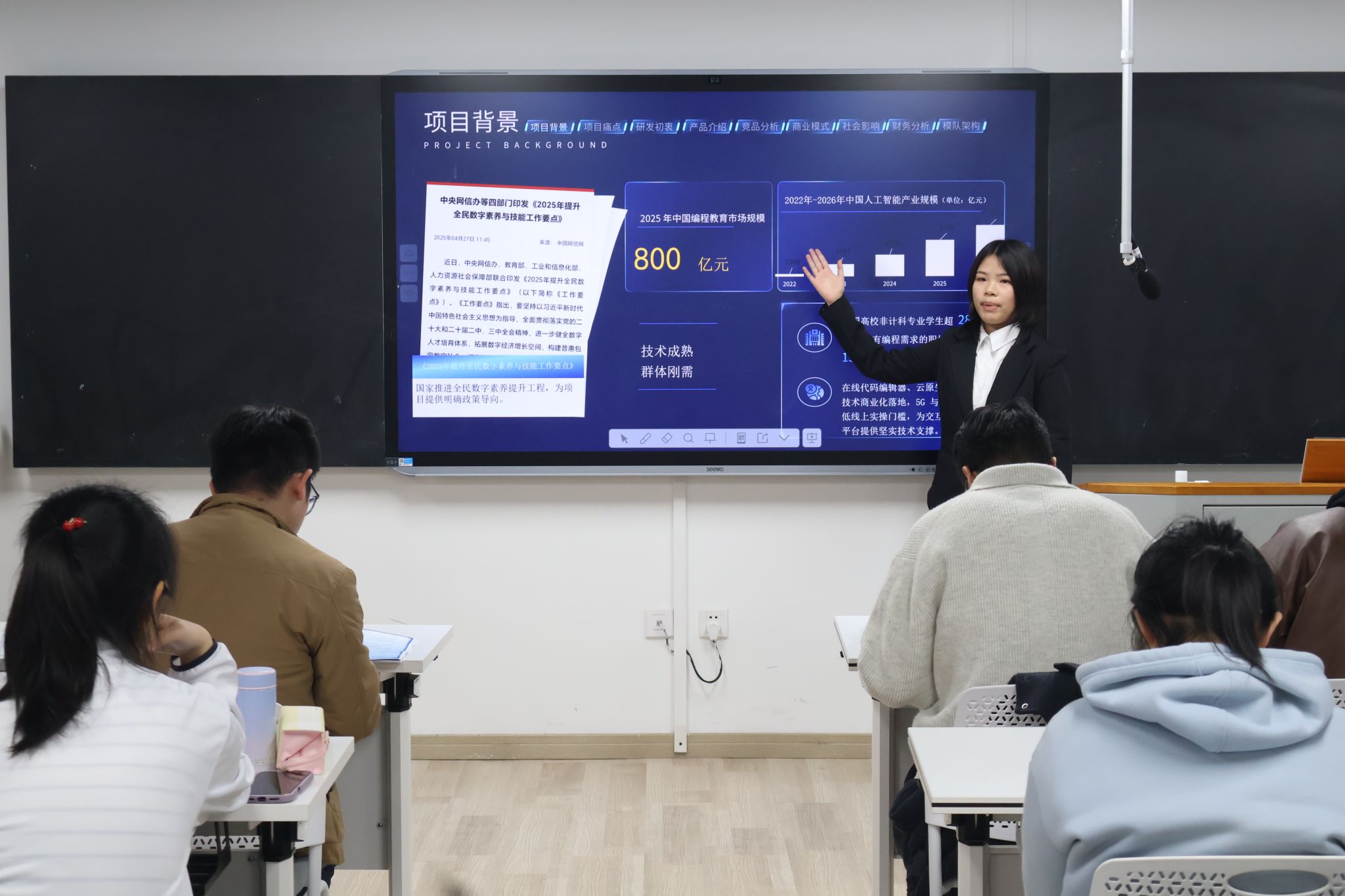 此次院赛共有4支队伍,涵盖科技创新、文化传承等多个前沿领域。参赛队伍紧密结合国家战略和经济社会的发展需求,充分发挥专业特长,在实践调研后制定出了各具特点的创新作品方案,并从服务主体、市场调研、项目开发、预期效果、最终目标等多方面进行了展示。