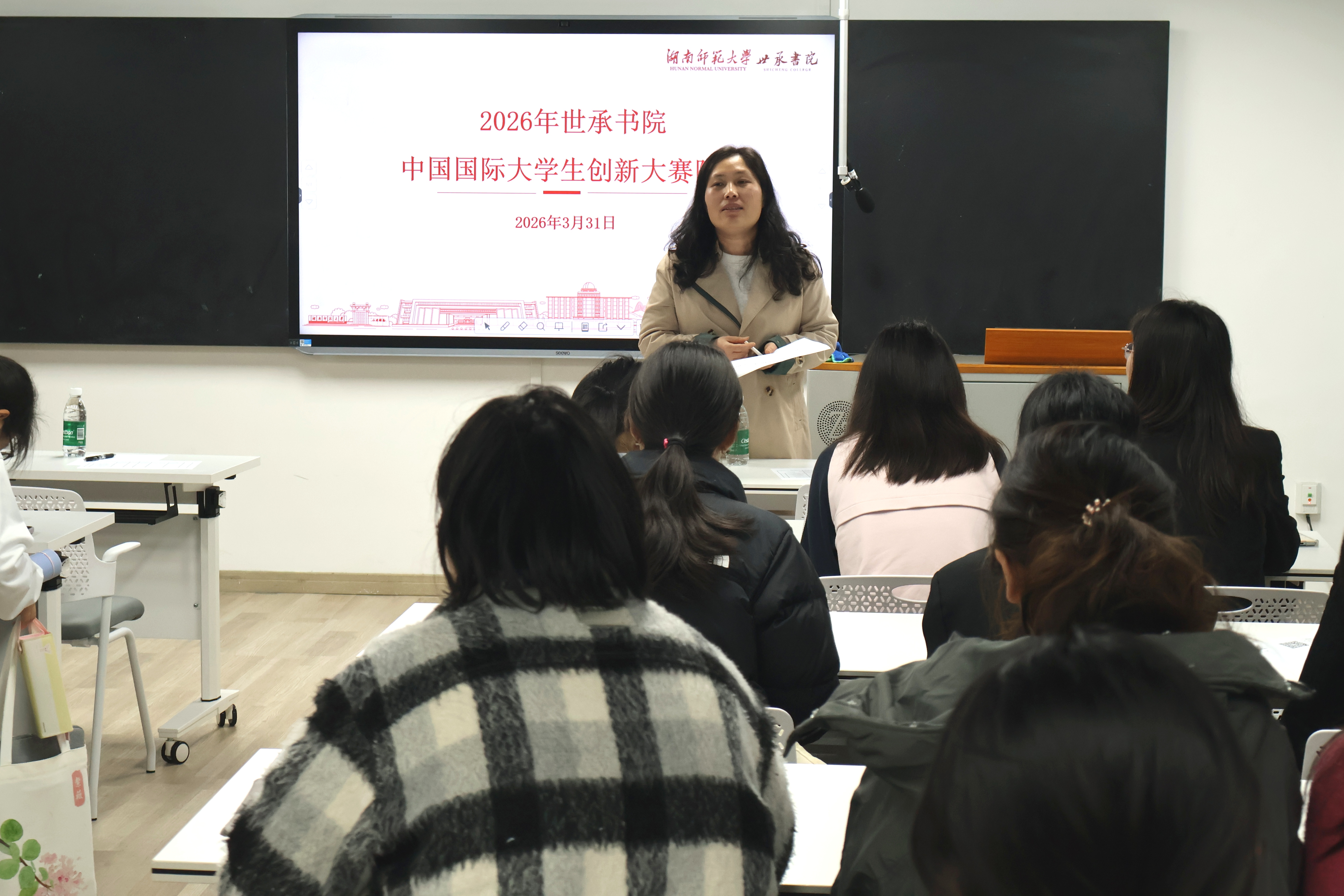 (通讯员 徐语璐 宦苏芹 王璐)3月31日中午,世承书院青年创新创业指导中心于书院128研讨室举办2026年中国国际大学生创新大赛院赛,湖南师范大学校团委办公室主任阎威臻、黑马科教控股集团有限公司董事长胡含兵、生命科学学院博士研究生李焘、世承书院副院长罗艳、世承书院团委书记刘铮以及各位辅导员老师担任评委。