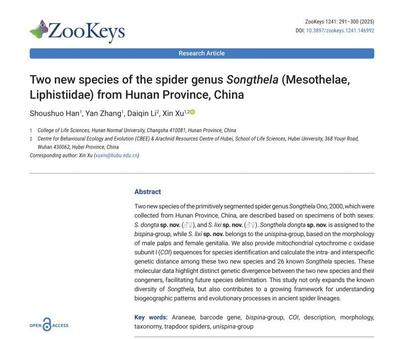 《ZooKeys》属于SCI收录期刊,创刊于2008年,由保加利亚Pensoft出版社出版,是专注于动物系统学领域的国际性学术期刊,在分类学、系统发育学及生物地理学领域具有重要的行业影响力。该论文以两性标本为研究基础,首次描述了采集自中国湖南省的原始分节蜘蛛宋氏蛛属两个新种——东塔宋氏蛛(S. dongta sp. nov.)和李溪宋氏蛛(S. lixi sp. nov.)。研究依据雄性触肢器和雌性生殖器的形态特征,将东塔宋氏蛛归入双刺组、李溪宋氏蛛归入单刺组;同时提供线粒体细胞色素c氧化酶亚基I(COI)序列用于物种鉴定,测算出两个新种与26个已知宋氏蛛属物种间的种内及种间遗传距离。相关分子数据清晰地揭示了两个新种与同属其他物种的显著遗传分化特征,为后续物种界定工作提供了重要数据支撑。本研究不仅丰富了宋氏蛛属的物种多样性记录,更为解析古老蜘蛛谱系的生物地理格局与演化进程构建了更加完善的研究框架。