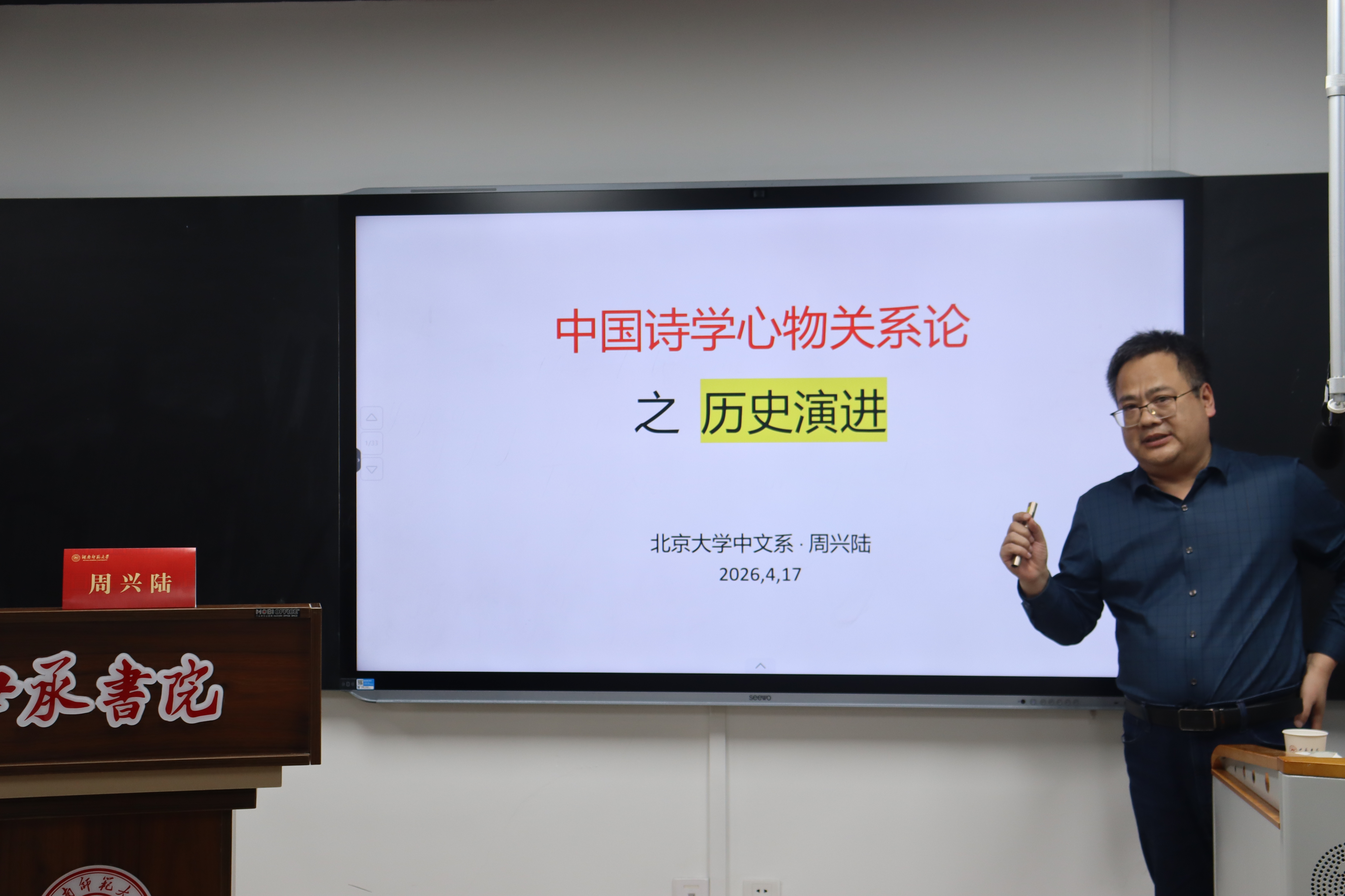 (通讯员 胡可欣)4月17日下午,世承讲坛第39期在世承书院128室成功举办。本次讲座特邀北京大学中文系教授周兴陆主讲,主题为“中国诗学的心物关系论”。讲座由湖南师范大学文学院教授胡海义主持,世承书院与文学院众多师生到场聆听、交流。