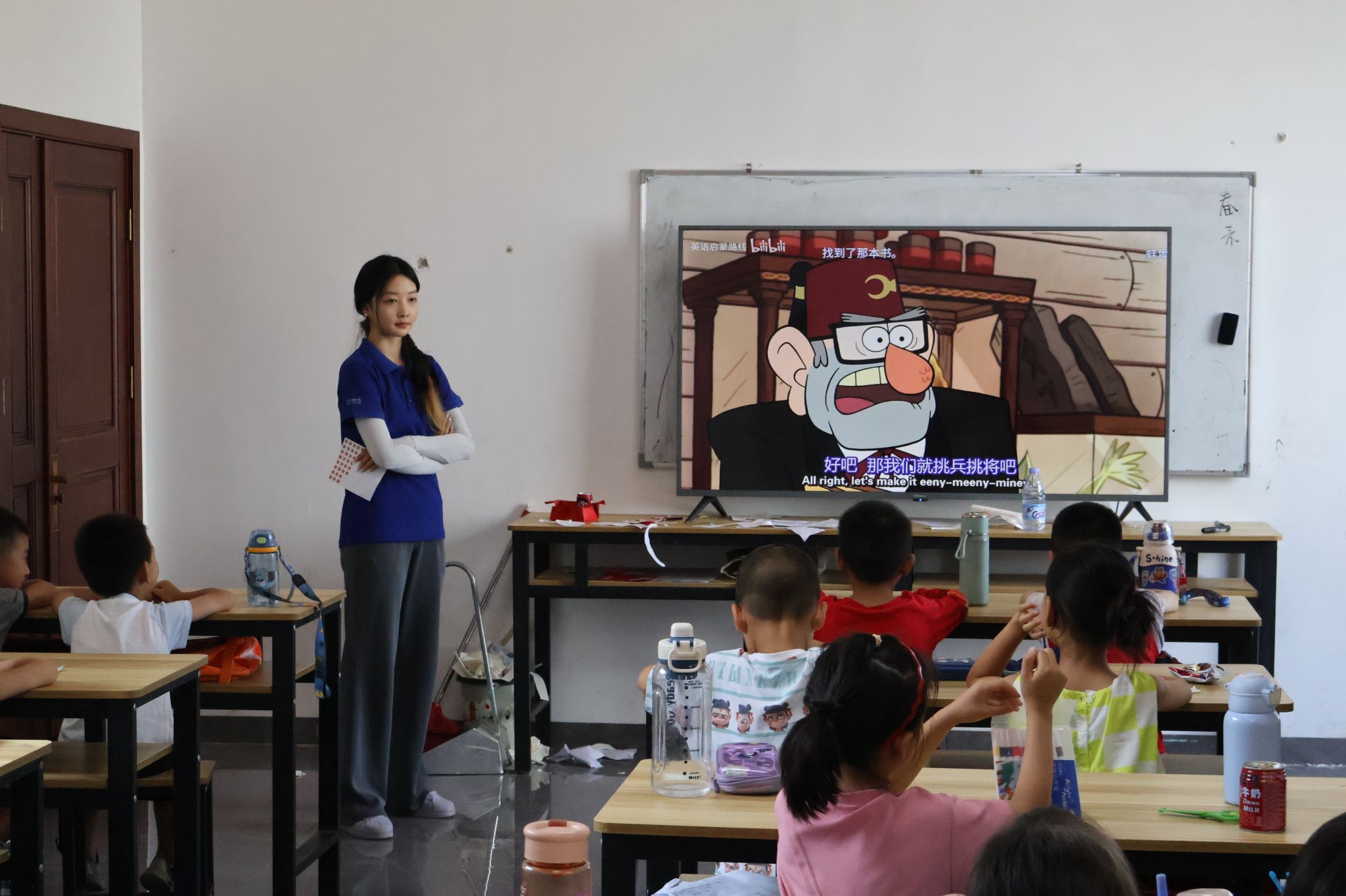 课堂开始前,实践团的教学组成员精心准备了多套配有中英文对照标签的人体图卡和彩色贴纸。主讲人张艺洋带领学生们随着音乐节拍,齐声高唱经典儿歌“Head, Shoulders, Knees & Toes”,在欢快的旋律中反复练习“head(头)”“shoulders(肩膀)”“knees(膝盖)”等基础词汇。教室里不时响起孩子们天真的笑声和整齐的呼应声,气氛热烈而轻松。