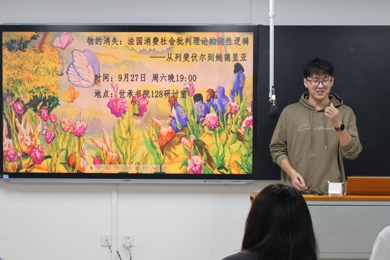 (通讯员 潘乐存 陈雨霏 陈炜轩)9月27日晚,世承书院“拾晞文谈”主题读书分享会第一期活动于书院128研讨室顺利举行。此次活动由2022级哲学基地班潘乐存主讲“物的消失:法国消费社会批判理论的隐性逻辑——从列斐伏尔到鲍德里亚”。