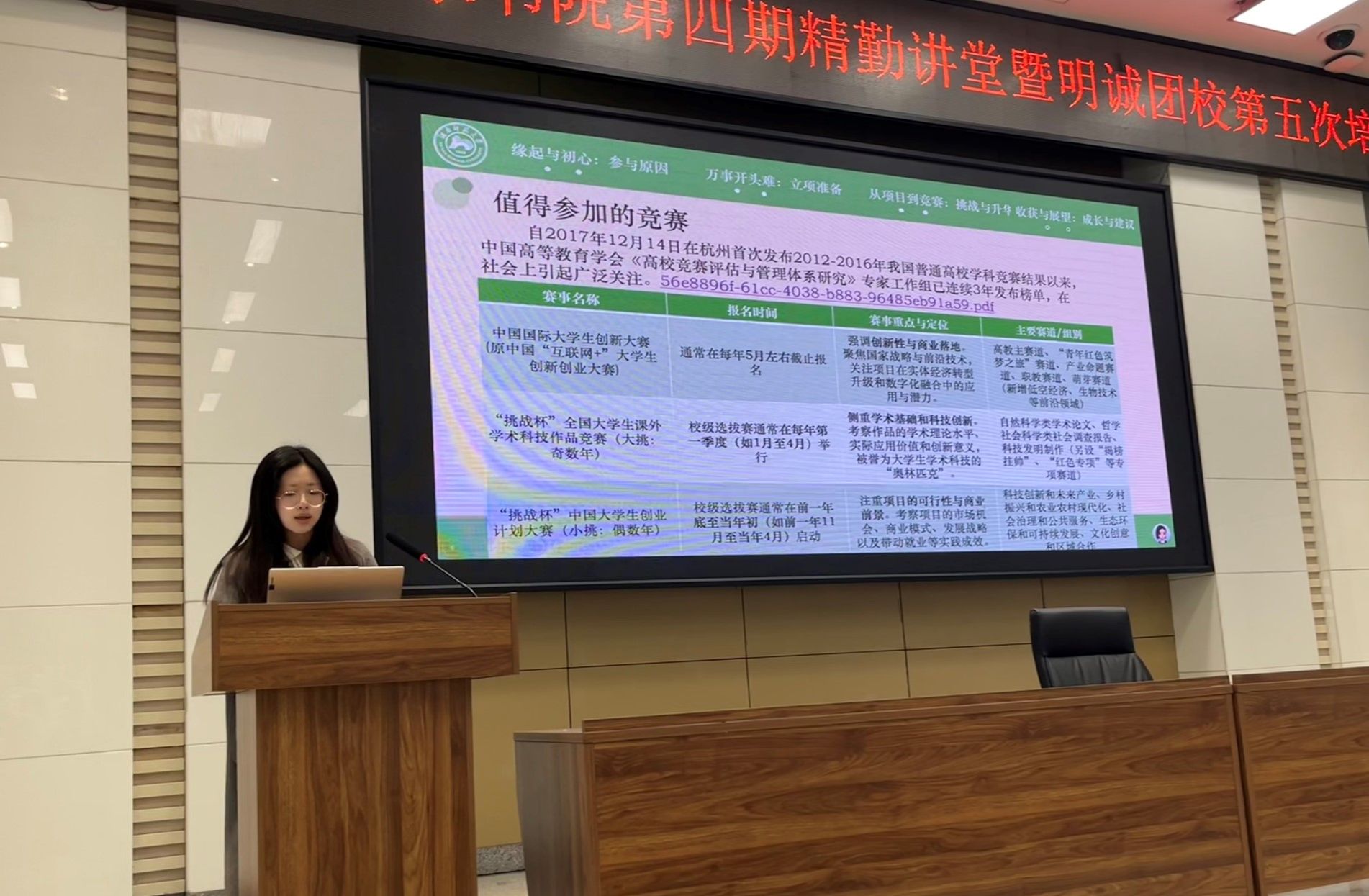 (通讯员 徐语璐 向响 王璐)11月27日中午,世承书院于至善讲堂举办第四期精勤讲堂暨明诚团校第五次培训。此次活动以“大创经验面对面:聚焦创新实践,分享实战经验”为主题,2023级锺书班柴碧婕和2022级浩青班孟宇彤担任主讲人。